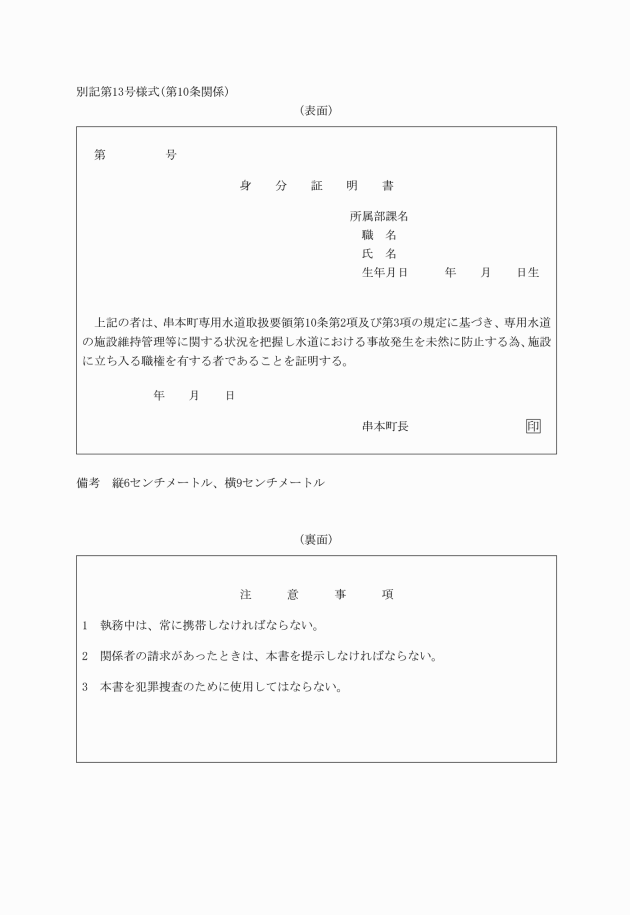 第10条 町長は、専用水道の施設維持管理等に関する状況を把握し水道における事故発生を未然に防止する為、法第39条に基づき、次の事項について指導監督業務を行うものとする。ただし、法第39条第2項の規定により立入検査を行う場合には、当該職員は、その身分を示す証明書(別記第13号様式)を携帯し、かつ、関係者の請求があったときは、これを提示しなければならない。
