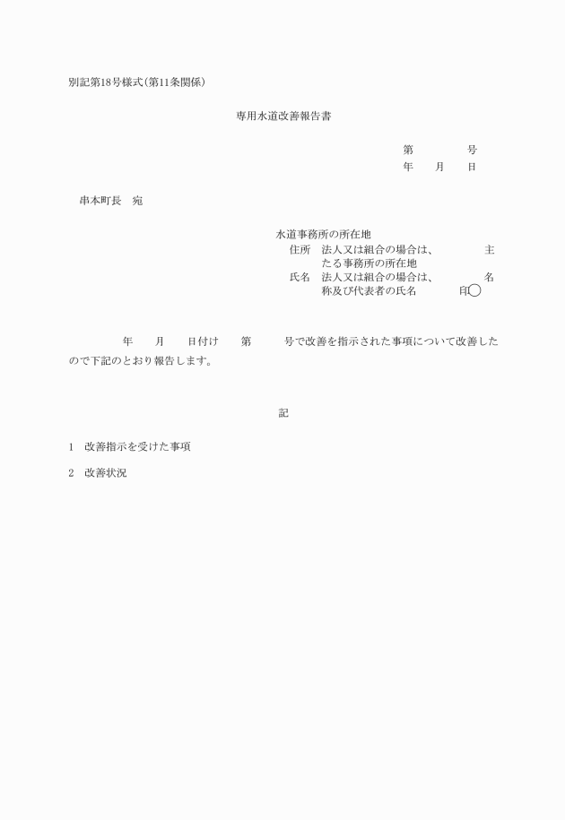 第9条 専用水道の設置者は、専用水道を廃止又は休止したときは、速やかに専用水道廃止(休止)届出書(別記第12号様式)により町長に届け出るものとする。