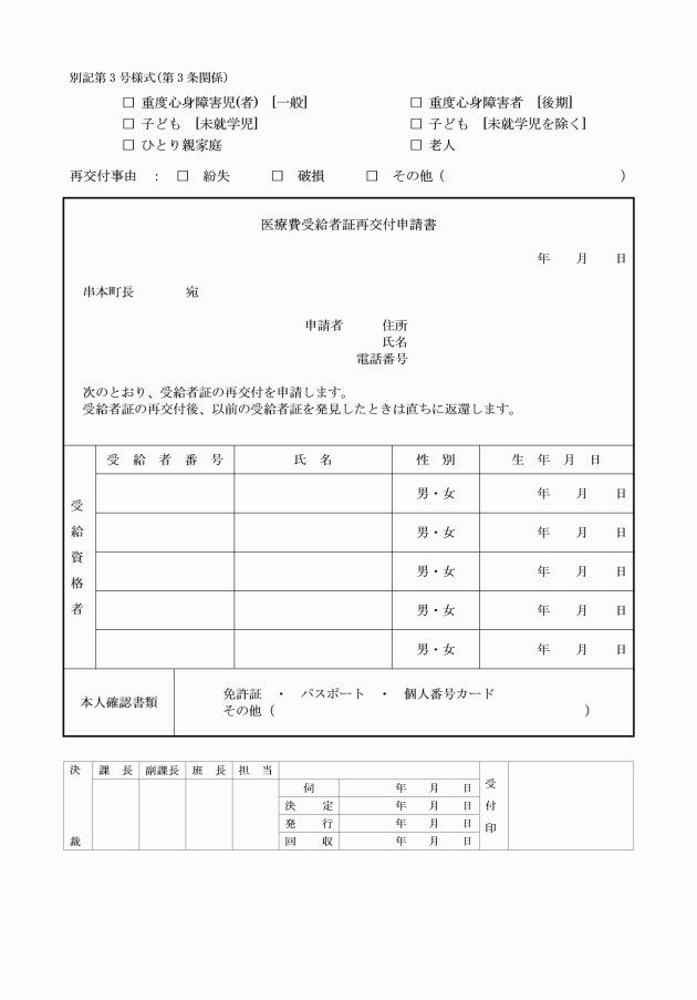 2 受給者証を破損し、又は亡失したときは、医療費受給者証再交付申請書(別記第3号様式)を町長に提出し、再交付を受けるものとする。
