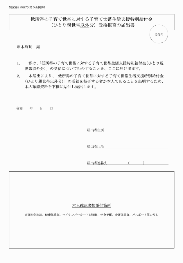 3 支給対象者は、低所得の子育て世帯に対する子育て世帯生活支援特別給付金(ひとり親世帯以外分)受給拒否の届出書(別記第2号様式)を町長に提出することにより、本給付金の受給を拒否することができる。