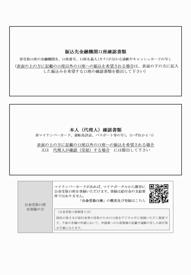 (1) 確認書の提出に基づく支給 あらかじめ確認書に印字されている又は申請者から通知された金融機関の口座に振り込む方法